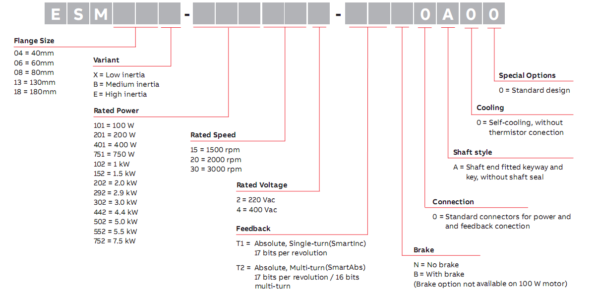 ESM系列伺服電機(jī)用于高動態(tài)精度的運(yùn)動控制由于其轉(zhuǎn)矩密度高,ESM系列伺服電機(jī)具有高動態(tài)響應(yīng)。單圈和多圈高分辨率值編碼器反饋可選件可匹配應(yīng)用要求。ESM系列電機(jī)外殼符合IP65防護(hù)等級。額定功率從0.1kW至7.5kW,五個標(biāo)準(zhǔn)的框架法蘭尺寸為40,60,80,130和180毫米,可添加制動可選件??蚣?0-80法蘭的電機(jī)提供引出線,方便電機(jī)動力和反饋的連接。